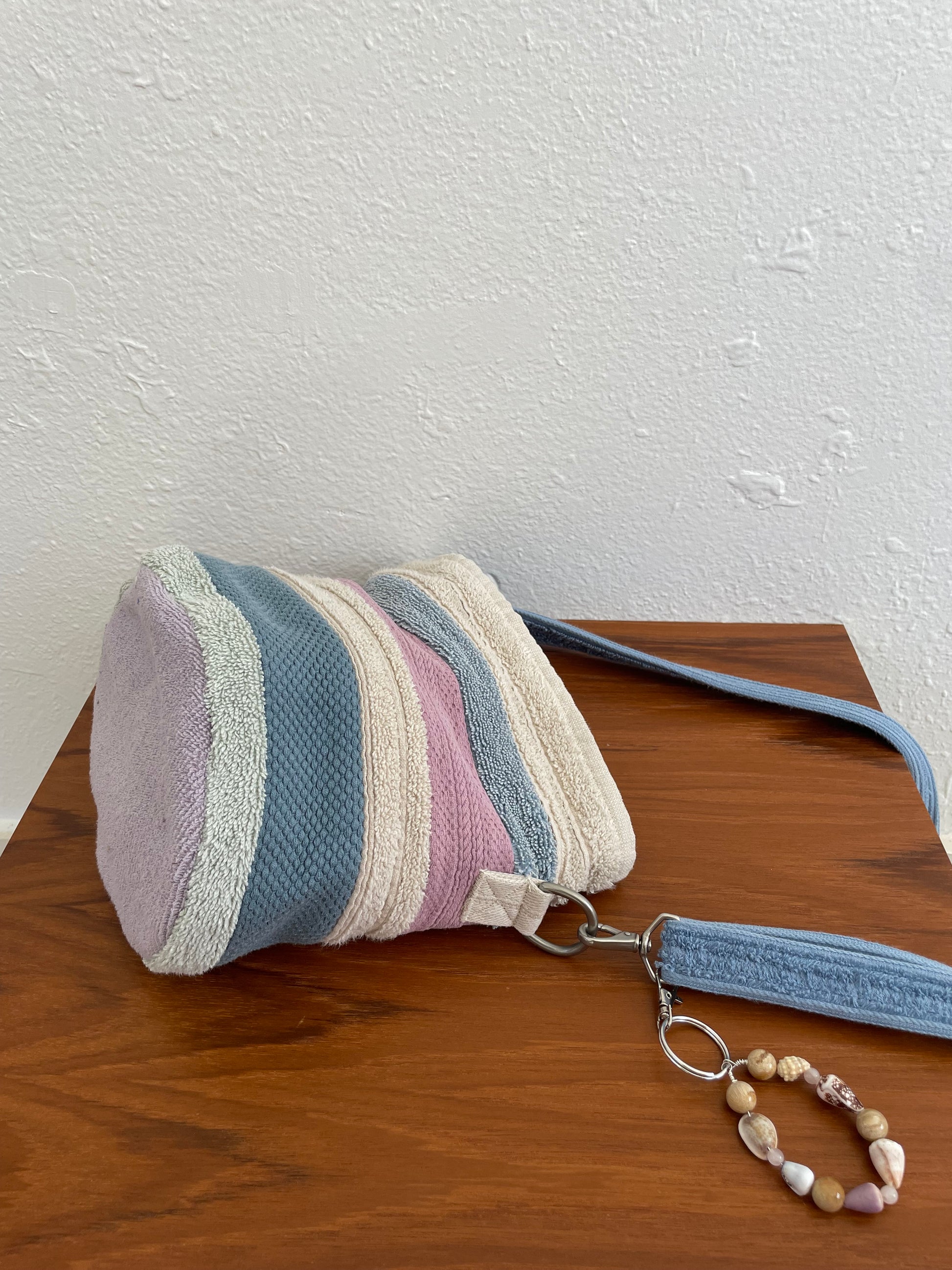 Exterior made with towel and interior lined with canvas. Snap closure. Detachable and adjustable strap. All hardware is solid brass with a nickel matte finish.