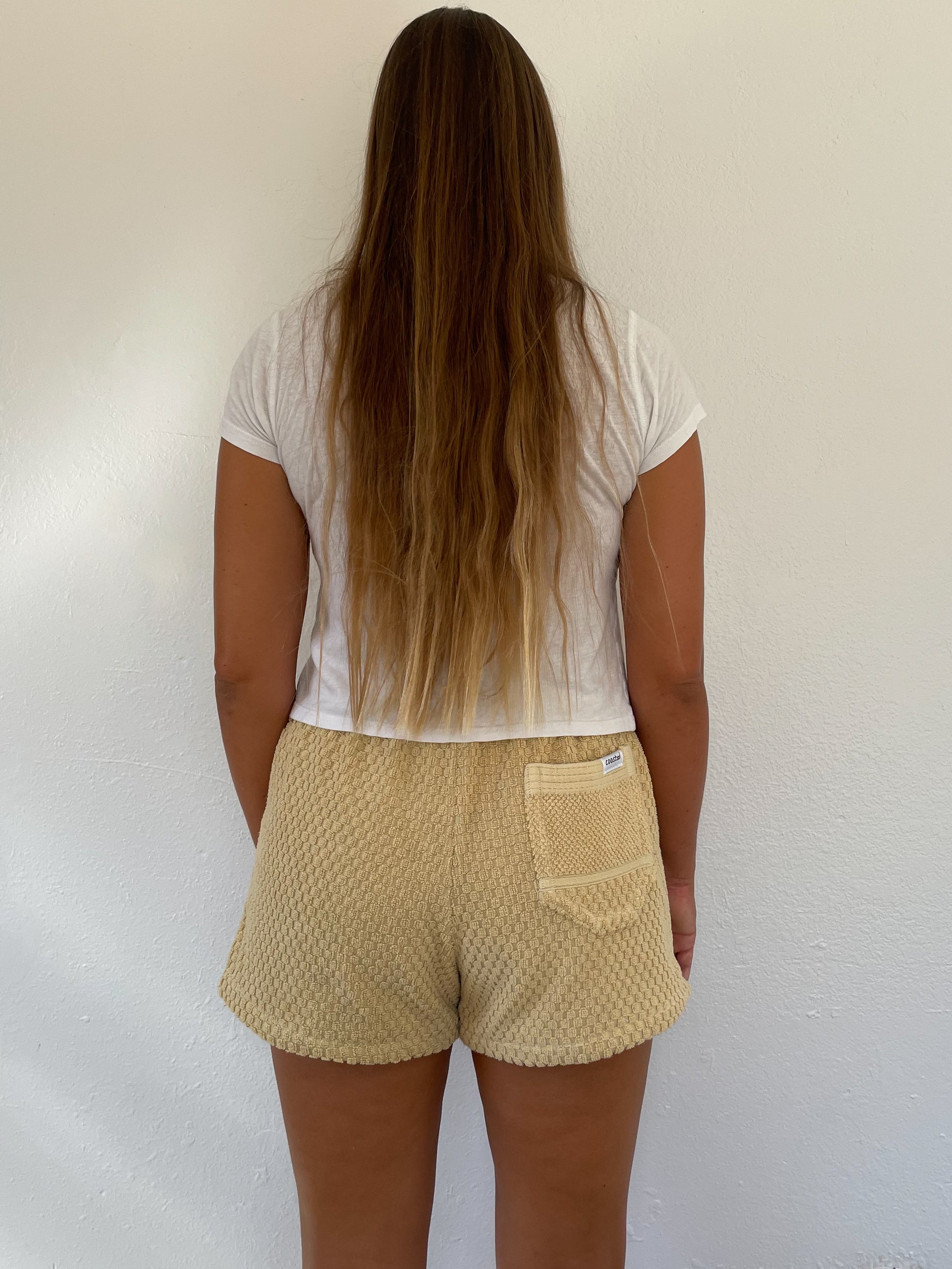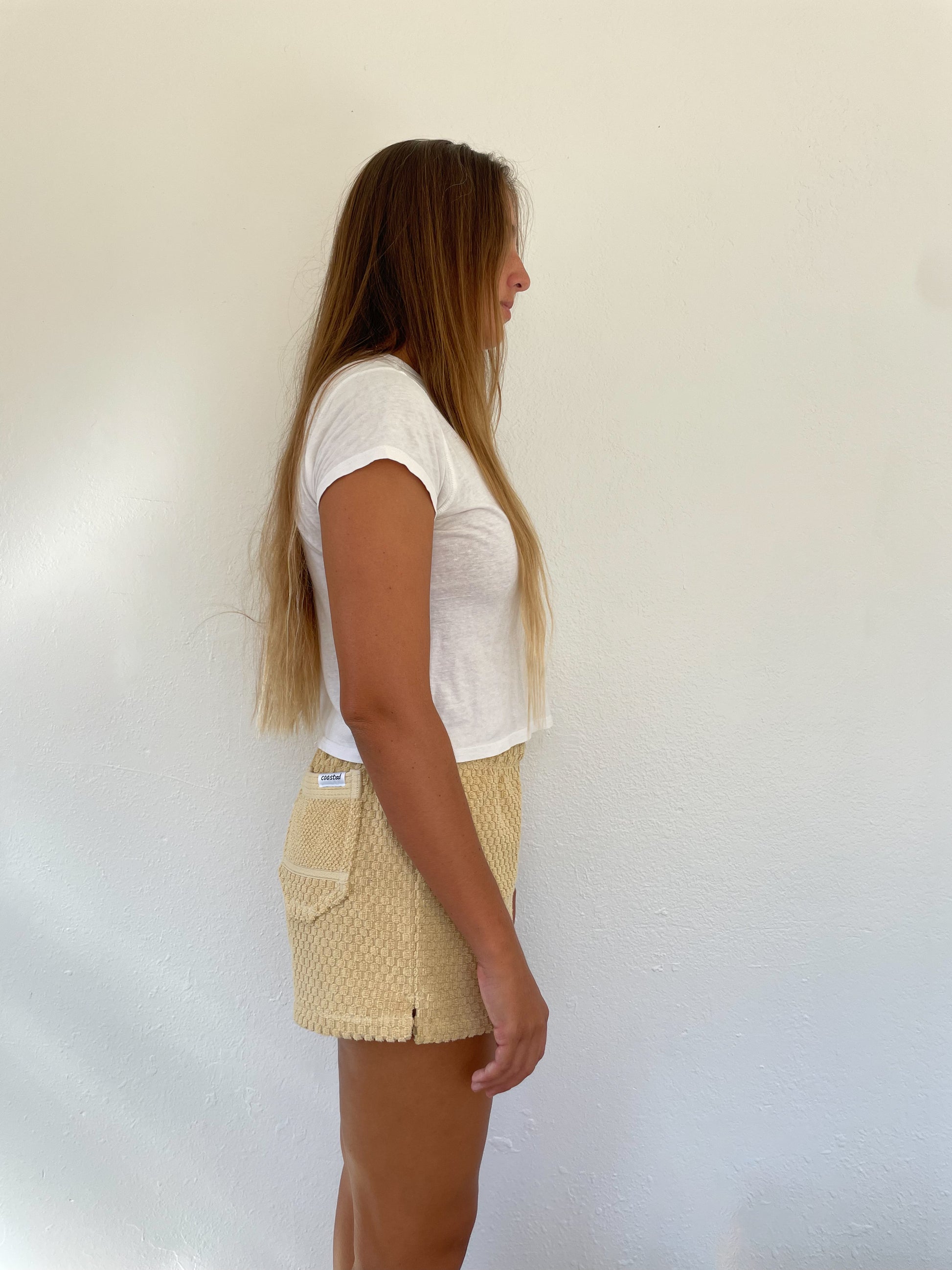 Featuring 2 inch side slits, a back pocket, an elastic waistband and a 3 inch inseam.