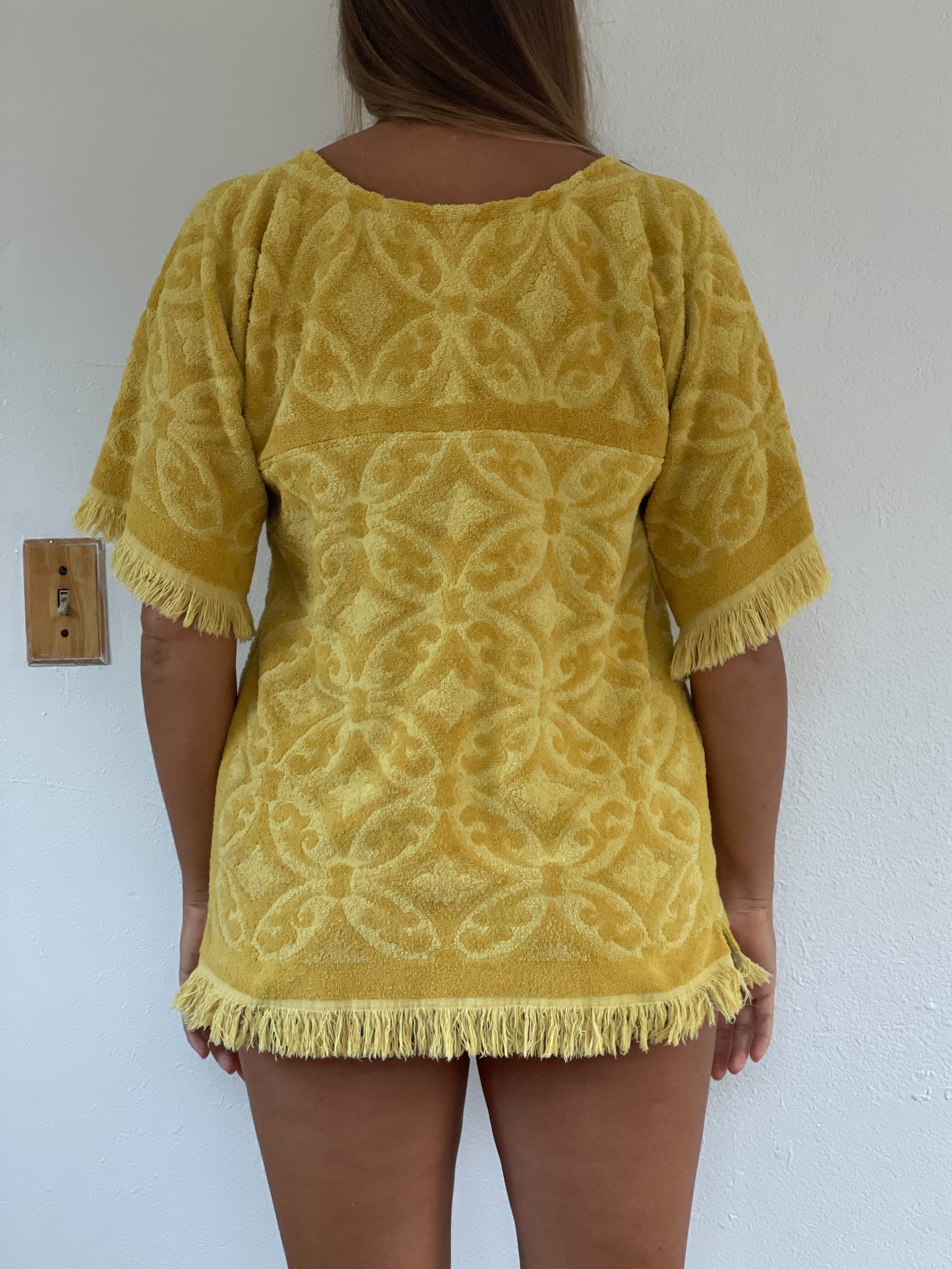 Tie front. Measures about 29" from shoulder to bottom hem. About 42" around chest.