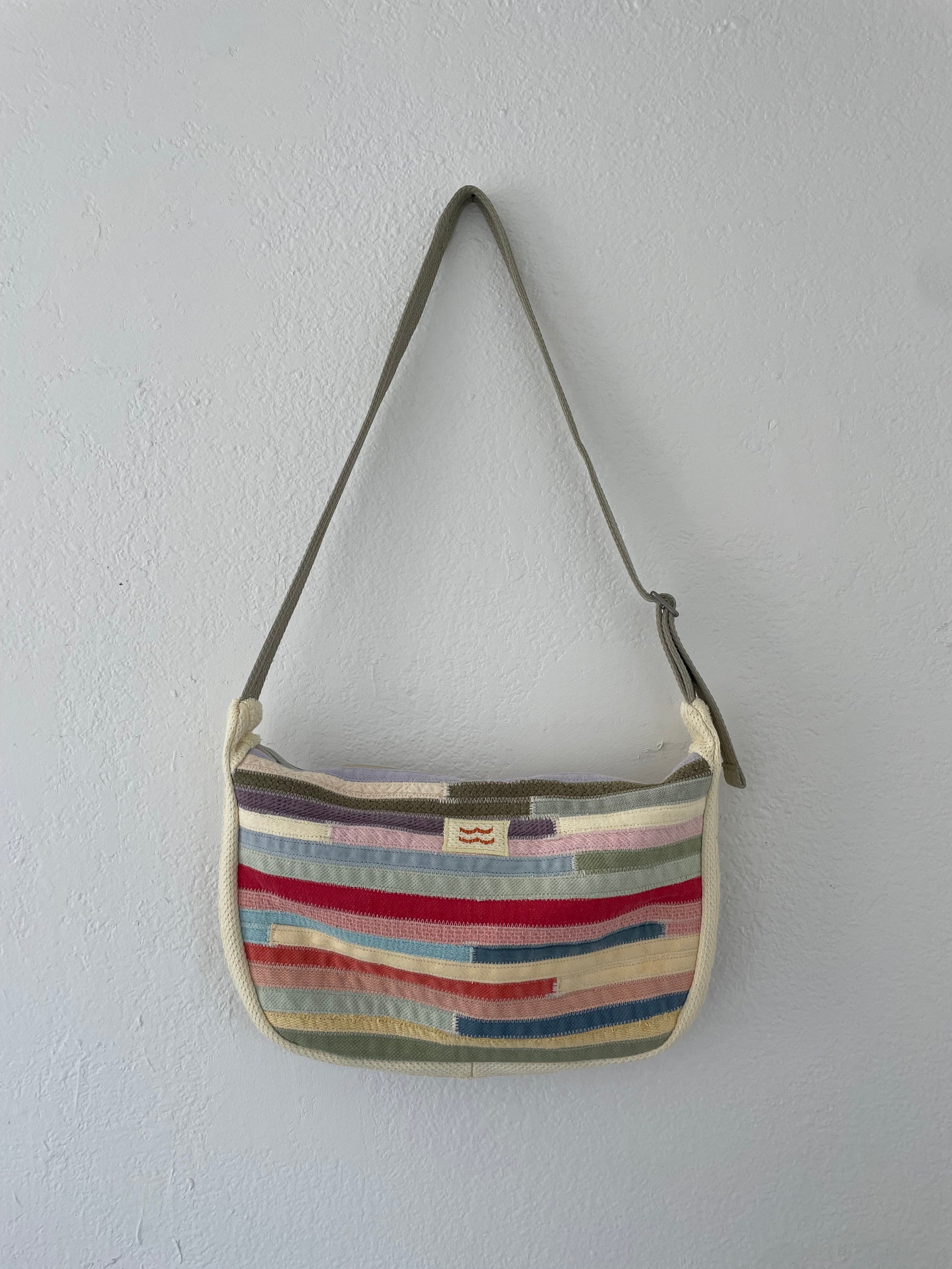 The body of the bag is about 10" (height) x 16" (width) x 2-3" (depth). Lined with a brown canvas material. Two interior pockets and an adjustable strap. Zipper closure.